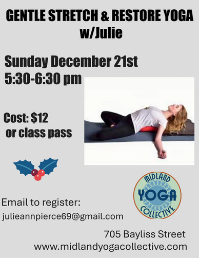 Calming Holiday Yoga for Everyone. A peaceful practice that includes gentle Yin yoga stretches and Restorative poses, centering breath work, and guided meditation to set you free from what weighs you down and promote a restful night's sleep. Props will be used to support the body, and you will have several minutes to explore sensations and relax in each pose. No prior yoga experience needed. BE SURE TO LET JULIE KNOW IF YOU HAVE ANY REQUESTS!