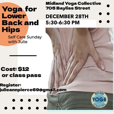 We could all use a little TLC post-Christmas/pre New Year's Eve! Join Julie for a practice that infuses the mindful movement and breathing that you expect from a yoga class with the targeted musculoskeletal techniques that Physical Therapy has to offer. This class is designed to address tightness in your hips and lower back, as well as weakness in your "core", that contribute to poor posture, lower back pain, and limited mobility.