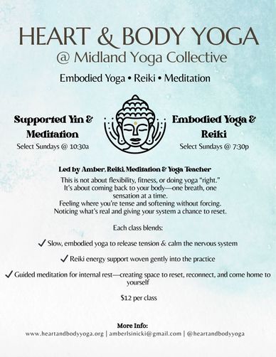 This practice blends gentle yoga with the subtle, healing energy of Reiki. Reiki is a gentle, non-invasive therapy involving light hand placement (or hovering hands-off) by the practitioner to promote relaxation, reduce stress, and support your body's natural healing abilities. As part of this experience, Amber will be offering Reiki to each student during the class.