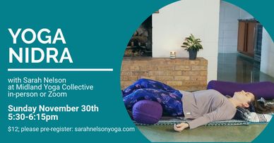 Registration: Pre-registration required; register and pay online at sarahnelsonyoga.com or email sarahlissanelson@gmail.com to pay with cash, check, or Venmo